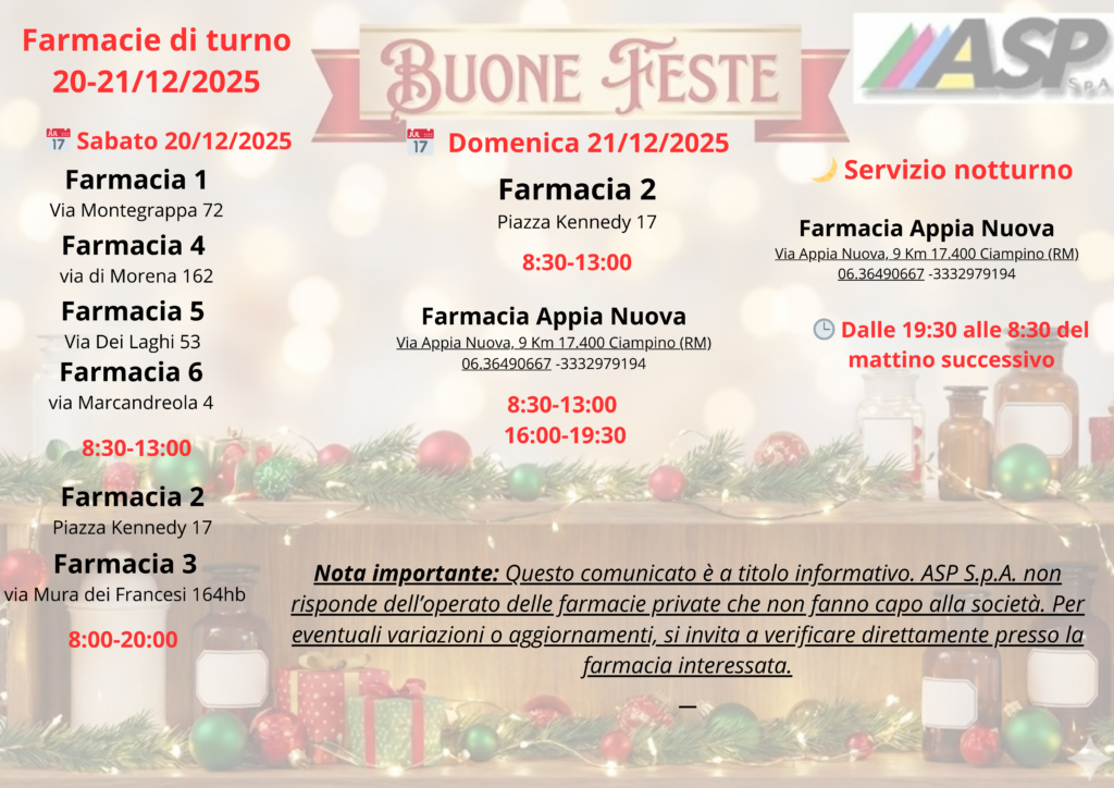 Asp Spa informa la cittadinanza che, per il fine settimana del 20 e 21 dicembre 2025, i servizi farmaceutici sul territorio comunale seguiranno l’articolazione oraria riportata di seguito.