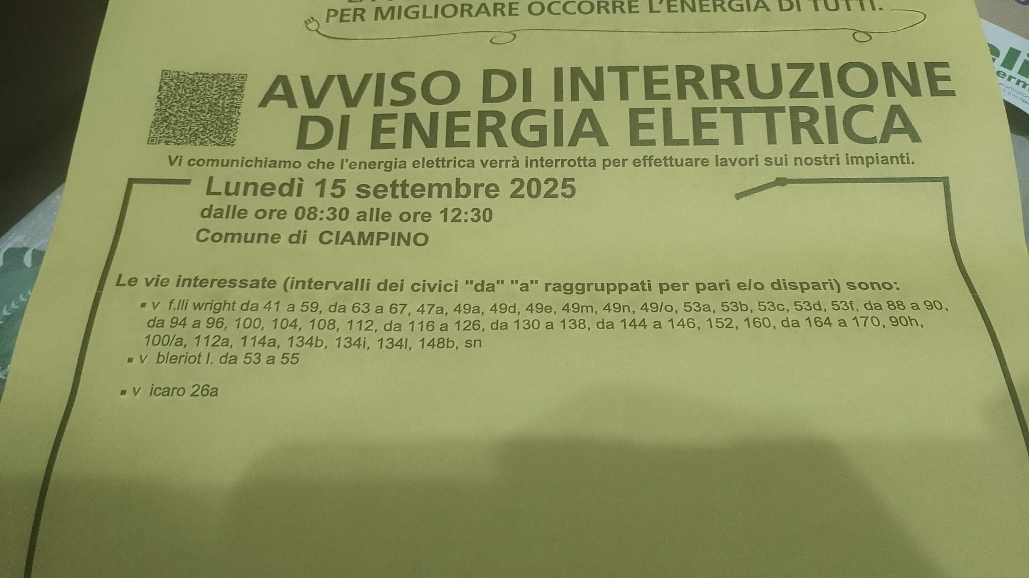 Asp Spa rende noto che, preso atto del comunicato affisso dalla Società e- Distribuzione Unità territoriale di Romana Sud sul cancello del nido Girasole, in copia allegato, in cui è riportato un avviso di interruzione energia elettrica nella giornata di venerdì 15 settembre 2025, dalle ore 08:30 alle ore 12:30, in tale giornata non potrà essere garantito il regolare svolgimento del servizio asili nido e la struttura pertanto rimarrà chiusa.