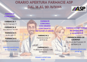 ASP Spa comunica l’orario delle farmacie di turno valido da Lunedì 16 a Venerdì 20 Giugno 2025