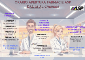 ASP Spa comunica l’orario delle farmacie di turno valido da Lunedì 23 a Venerdì 27 Giugno 2025