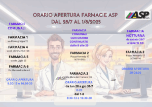 Asp Spa informa la cittadinanza sugli orari delle farmacie di turno da Lunedì del 28 luglio a Venerdì 1 Agosto 2025.