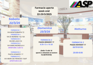 Asp Spa comunica l’orario di apertura delle proprie farmacie durante il week-end dei giorni 22-23 Marzo 2025