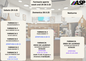 Asp Spa comunica l’orario di apertura delle proprie farmacie durante il week-end dei giorni 29-30 Marzo 2025