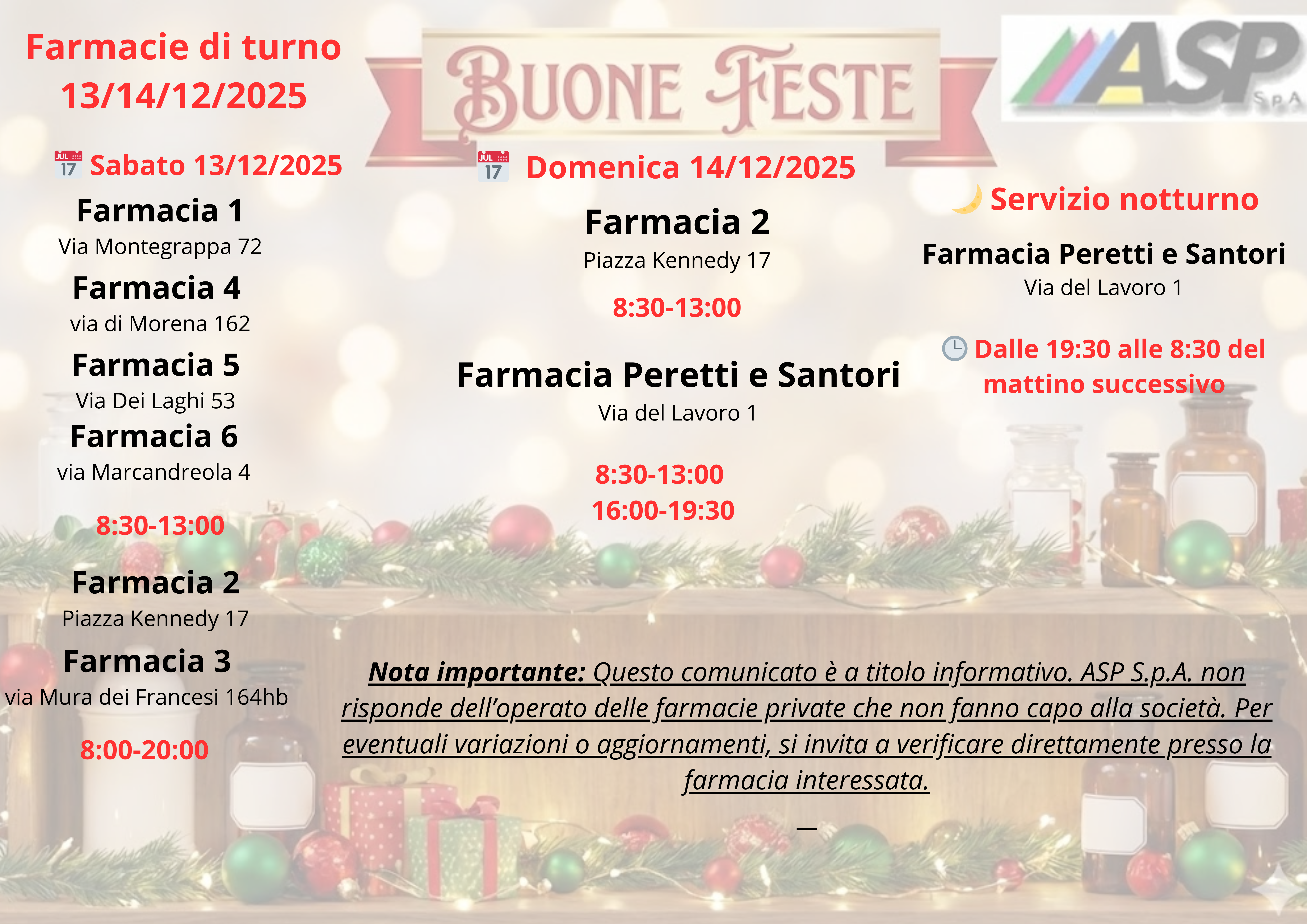ASP S.p.A. (Azienda Speciale Multiservizi e Patrimonio) comunica alla cittadinanza di Ciampino il calendario e gli orari delle farmacie che saranno in servizio di turno per il fine settimana del 13 e 14 dicembre 2025.